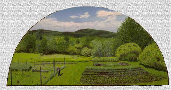 June Garden - 4' x 8' - oil on plywood. This is the biggest semi-circle I can get out of a piece of plywood. This is the year's peak of greenness, mid June. © Lynne Harwood 1991.
