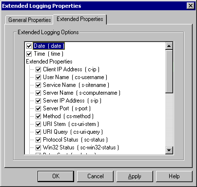 Make sure that both the Date and Time check boxes are checked. To simplify my installations, I check every Extended Property checkbox. There are some specific items that could probably not be included (such as Server Port for a port 80 only server), but additional items typically don't add much to the file size of the log files.