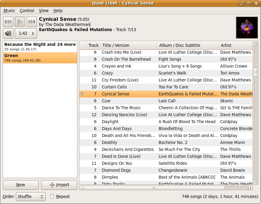 You may wonder whether Quod Libet doesn’t have so-called “dynamic” or “smart” playlists as you may know them from other music players, that is, playlists that automatically update themselves for example to always contain all songs from a certain artist that you have in your library.