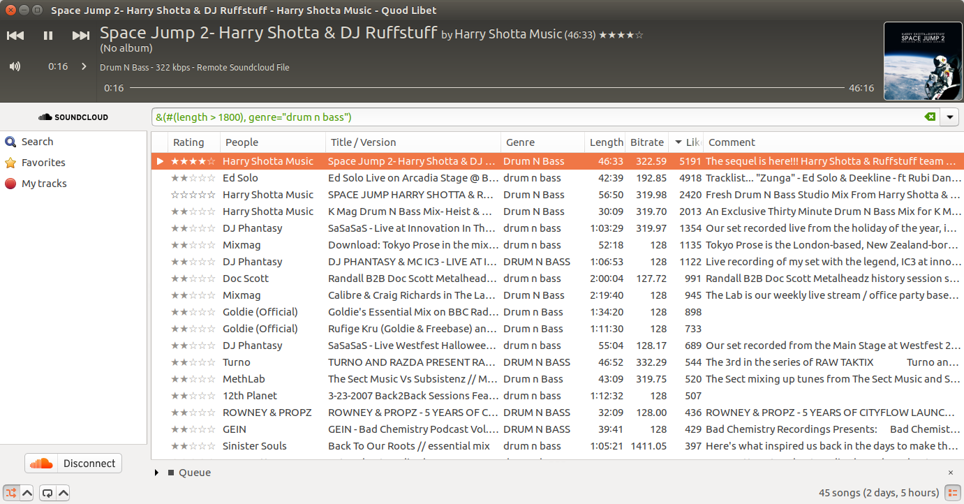 This browser lets you interact with Soundcloud and play tracks from the millions on offer. Where possible it aims to keep the look and feel as familiar and integrated to the Quod Libet experience as possible.