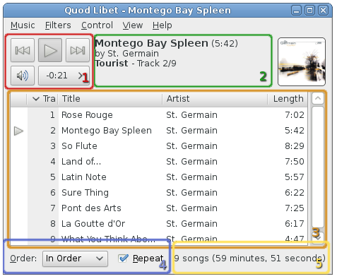 When you start up Quod Libet for the first time, and have configured your library, it should look something a little like the screenshot here, which is show with annotations. These are all explained below.