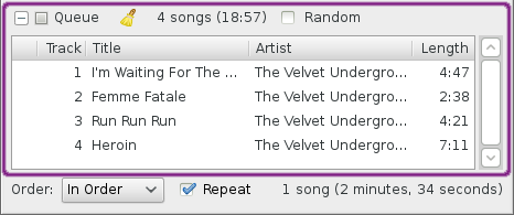 As the name suggests, the song list is a list of matching songs presented by the current browser. Double-clicking a song in the song list will start playing it immediately.