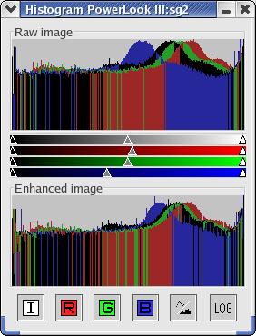 ![]() The histogram shows the color density of the area that is selected in the preview window. The top histogram represents the scanned raw image, the bottom histogram represents the enhanced image. In grayscale mode, there are three sliders in the gray range. The black slider defines the black point, the white silder the white point and the gray slider the gray point (gamma). If the rgb default button (in the xsane main window) is not selected in color mode there are also sliders in the red, the green and the blue range. In this case a move of a slider of the gray range also moves the sliders of the color ranges. |